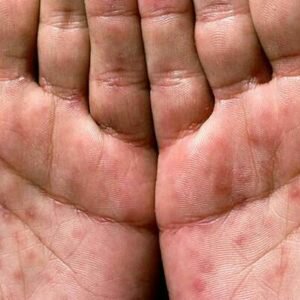 * Small blisters on the hands and feet that change to a copper colored rash, which may be bumpy or flat, and spread to the face